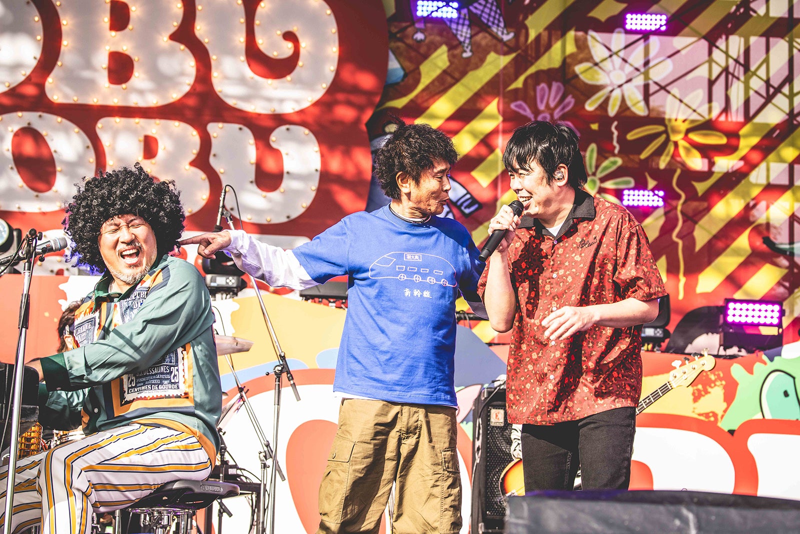 DAY1のヘッドライナーは浜田。まずは「エキセントリック少年ボウイのテーマ」を、『ごぶごぶラジオ』の面々と軽快に響かせる。ノスタルジックなスライドギターが印象的な「幸せであれ」の後、「ここでガス抜きさせてもらっていいですか?カラオケに行ったら絶対に歌う曲なんです」と、内藤やす子の「六本木ララバイ」を悦に入って歌う浜田に、「止めて止めて!」と駆け寄ったのはオカモトだ。いわく「ラジオでは共演してますけど、物理的に隣にいるのを皆さんに見られるのは今日が初めて」という初の親子フェス共演に、終始「やりにくいわ~」と返す浜田だったが、親子でセッションした「春はまだか」は、まぎれもなくこの日のハイライトだったと言えるだろう。最後は出演者が次々と呼び込まれ、H Jungle withtのヒット曲「WOW WAR TONIGHT 〜時には起こせよムーヴメント~」を、アーティストもオーディエンスも一体となって大合唱。木村やDA PUMPのTOMOも感極まるなか、親子共々感謝を述べる感動的なラストシーンで初日を締めくくった。