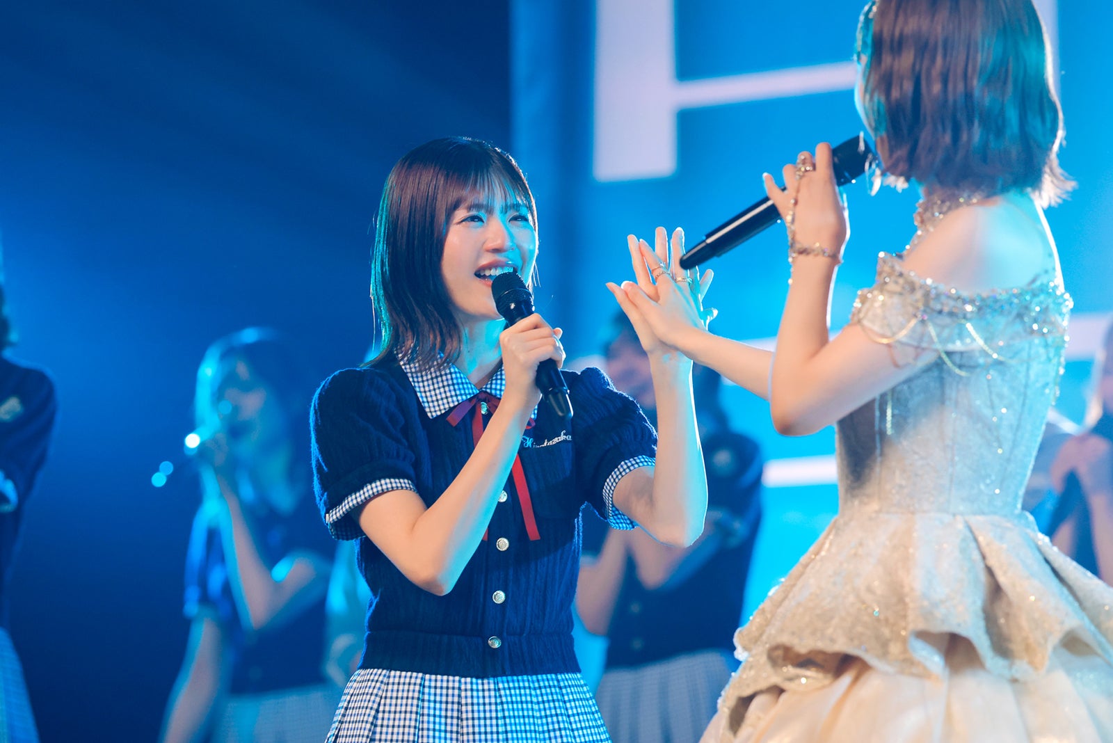 富田が語り終えたところで、二期生~五期生までのメンバーたちがそれぞれ花を持ってステージに出てくる。そして、全メンバーから富田への感謝の思いが伝えられた。それを受けた富田は、メンバーの方を向いて「卒業することって、迷うし決断のいることだけどこういう瞬間が私にもあってよかったなって思うし、みんながこんなに想ってくれているんだなと思うと、もうこの先何十年もこの日のことで生きていけます、この日のことで白米を食べるぞー!」と改めてメッセージを送り、メンバーを笑いに誘った。