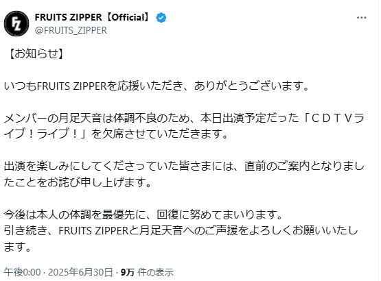 FRUITS ZIPPER公式X(旧Twitter)は【お知らせ】とし、「いつもFRUITS ZIPPERを応援いただき、ありがとうございます。メンバーの月足天音は体調不良のため、本日出演予定だった『CDTVライブ!ライブ!』を欠席させていただきます」と報告。「出演を楽しみにしてくださっていた皆さまには、直前のご案内となりましたことをお詫び申し上げます」と謝罪し、「今後は本人の体調を最優先に、回復に努めてまいります。引き続き、FRUITS ZIPPERと月足天音へのご声援をよろしくお願いいたします」と伝えた。(modelpress編集部)情報:TBS