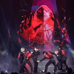 天使の衣装を身にまとった映像がスクリーンに映し出される中、オープニングを飾ったのは「無限シニシズム」。白いフードを深く被ったメンバーが上方から登場し、その姿は顔が見えず、スクリーンにも映されない。観客は自然と本人たちの動きに視線を集中させた。曲が進むにつれ、ゆっくりとステージへと降り立つ姿が神秘的な空気をまとっていた。続く「Museum:0」では、メンバーがフードを取り、白い衣装を脱ぎ捨てると会場は大きな歓声に包まれた。「in the Fate」では「Are You Ready?」と観客を煽り、火花や炎が噴き上がる演出で熱気は上昇。さらに「0to1の幻想」では、ダンスブレイクを挟みながら、花道を駆け抜けてセンターステージへ。そのまま「嘘から始まる自称系」では、メンバーカラーで染まったステージで長野凌大、小泉光咲、大倉空人、吉澤要人、杢代和人、武藤潤、桜木雅哉の順にそれぞれソロダンスで魅了した。