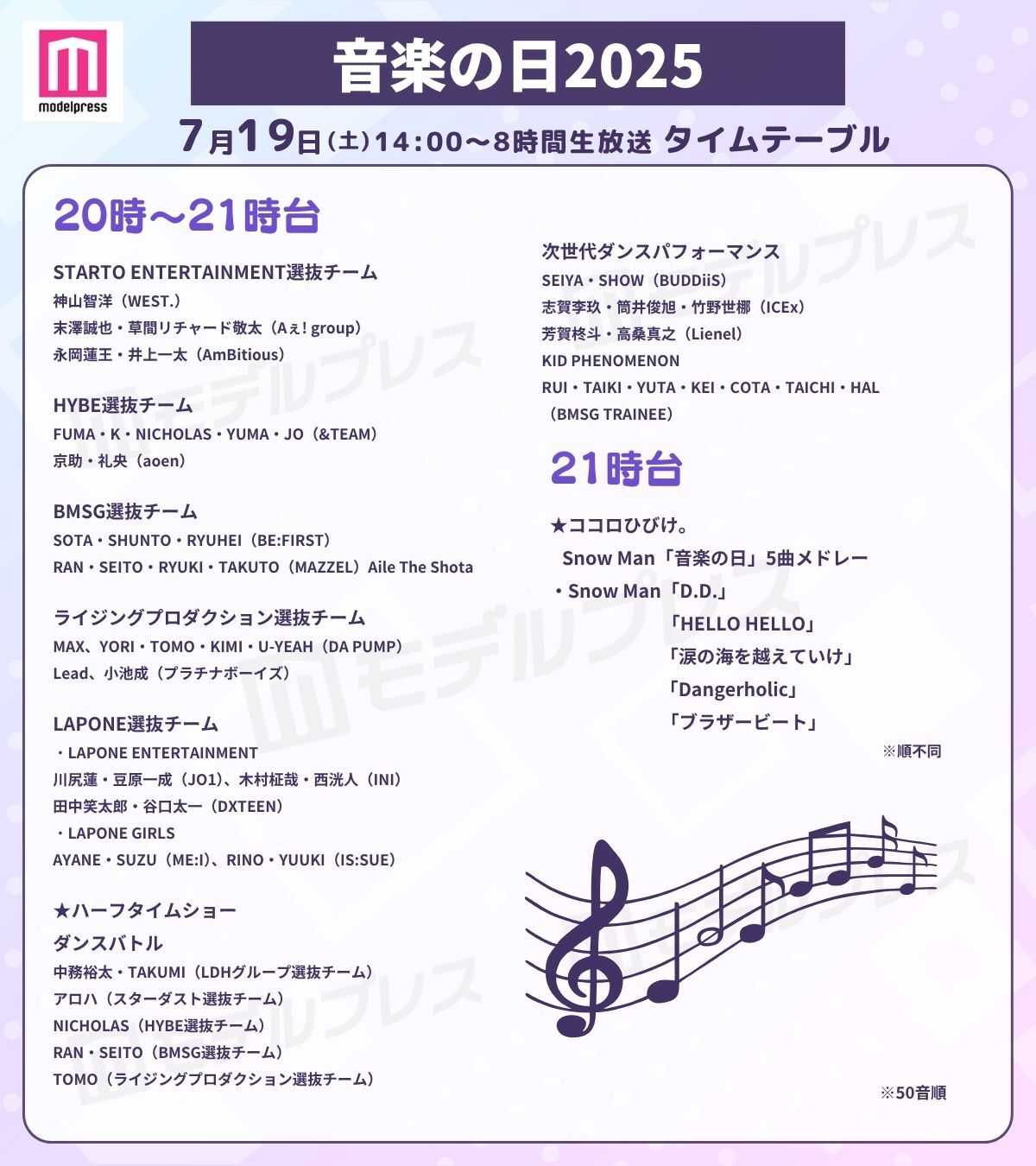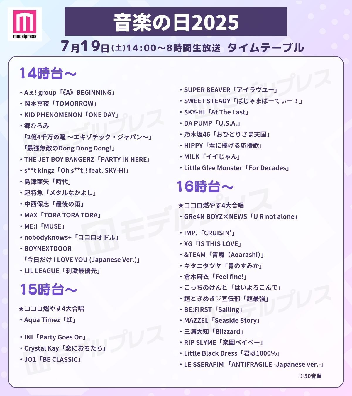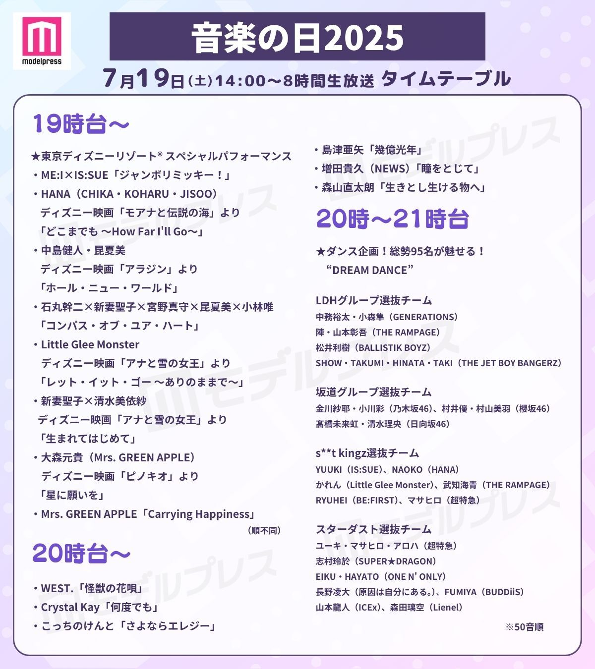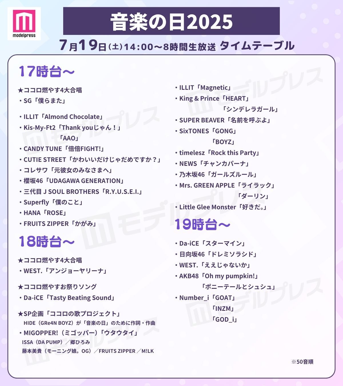 TBSでは、7月19日午後2時から8時間にわたって夏の大型音楽特番『音楽の日2025』を生放送。タイムテーブルが公開された。