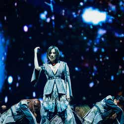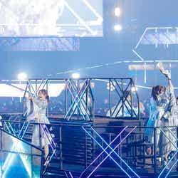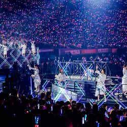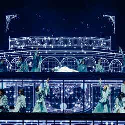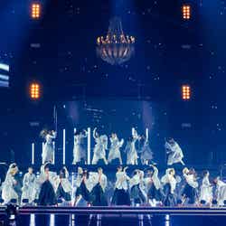 二期生、三期生の期別曲ブロックを終えると、いよいよ4月に新加入の四期生が登場。ムービングステージに乗った9人が姿を現すと、アリーナ後方からゆっくりとメインステージへと移動していく。彼女たちの参入を祝福するような演出で会場が温かな空気で包まれると、「死んだふり」を全身全霊の歌とダンスで表現。センターの山田桃実を中心に最後には満面の笑みを浮かべるなど、堂々とした佇まいで四期生の存在をアピールした。アリーナ中央から登場した藤吉がメインステージに向けて歩き出すと、繊細さや儚さが際立つ「偶然の答え」で場の空気が再度変化。「TOKYO SNOW」ではステージ上に雪が舞い、会場は一瞬にして冬模様と化す。また、「Nothing special」では上空に吊るされた鉄骨に座る中嶋優月を中心に、11thシングルBACKSメンバーが優しい歌声を届けてくれた。メロウ&ムーディーな楽曲で固められたブロックを締めくくるのは、複雑な曲構成を持つ「I want tomorrow to come」。ピアノバラード調から情熱的なアレンジへと転調すると、メンバーは生命力に満ち溢れたダンスで再び活気を取り戻していく。すると、楽曲の途中から四期生もパフォーマンスに加わる演出を披露。この楽曲は6月に開催された「四期生 First Showcase」にて四期生のみで披露した楽曲ということもあり、非常にエモーショナルな展開となった。”ドーム”という大舞台で初めての先輩メンバーとの共演を見事に全うしてみせた。