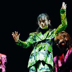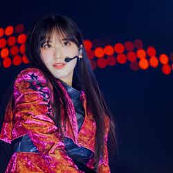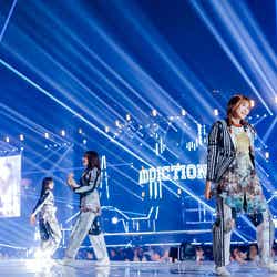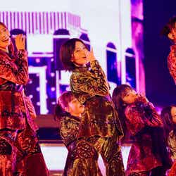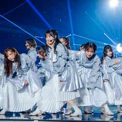 オープニングでは摩天楼を彷彿とさせる映像&照明演出、ステージ前方から吹き上がる噴水演出ともに、ジャジーなビッグバンド風サウンドに乗せてメンバーが次々に登場すると、2チームに分かれてダンスを披露。続いてステージ中央で藤吉夏鈴&山崎天(※「崎」は正式には「たつさき」)がペアダンスにてオーディエンスを煽り、最後に二期生と三期生が勢揃いしたところでライブは「Addiction」から勢いよくスタートした。ピンクとイエローグリーンを基調にした2種類の衣装に身を纏ったメンバーたちは躍動感の強い、息の合ったダンスで早くも観客を魅了。続く「半信半疑」ではステージ両サイドに散ったメンバーが個々の存在感をアピールし、エンディングでは山崎のソロダンスをフィーチャー。さらに、力強いビートに導かれて始まった「Start over!」ではセンターの藤吉を中心に、歌とダンスでドラマチックな世界観を展開し、会場は早くもクライマックスのような盛り上がりをみせた。