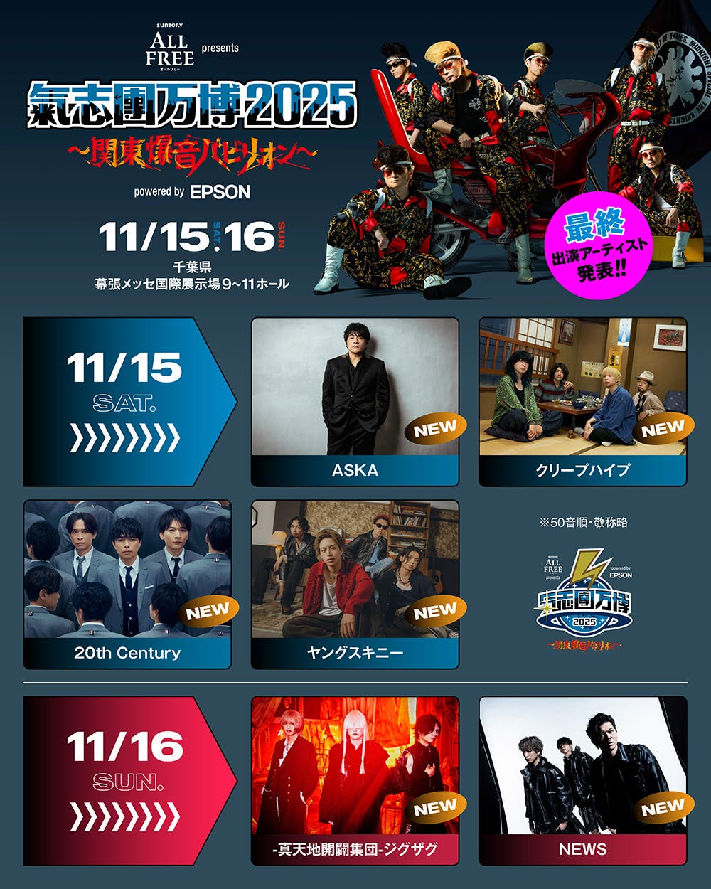 11月15日・16日の2日間、千葉県・幕張メッセにて開催される「サントリー オールフリーpresents 氣志團万博2025 ~関東爆音パビリオン~ powered by Epson」(以下:氣志團万博2025)より、最終出演アーティストが発表された。