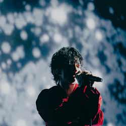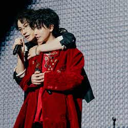 そして2曲目にはヒットチャートにもランクインする人気曲、「旋律と結晶」を披露。佐藤はステージの端まで走り回り、ラストのサビ前には「歌ってくれ!」と客席にマイクを掲げる。宮崎のドラムソロでは3人が宮崎を囲み、笑顔を交わしながら聖地ライブを満喫している姿が印象的だった。そしてドラムソロに導かれるように疾走感溢れる「約束のうた」へ。佐藤、町田、志尊がステージ中央に集まったり、佐藤が町田と顔を突き合わせ至近距離で歌ったり、ドラマから飛び出したかのようなシーンの連続にファンの興奮は止まらなかった。