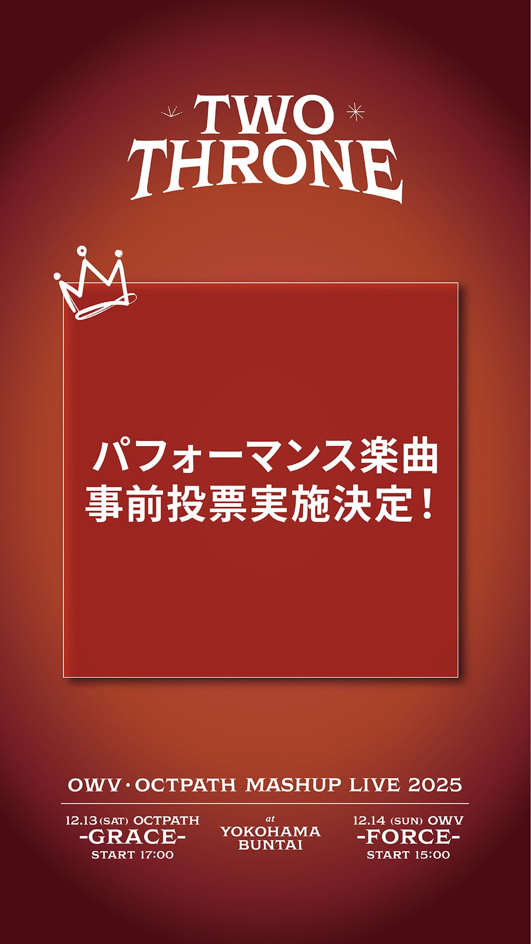 今回のライブでは、DAY1に【OCTPATHがOWVの楽曲】を、DAY2に【OWVがOCTPATHの楽曲】をパフォーマンス。「それぞれにパフォーマンスしてほしい!」という楽曲を1曲ずつ選び投票することができる。各日、投票の多かった楽曲をステージで披露。ファンの一票が「TWO THRONE」の演出のひとつになる。なお、投票方法は各オフィシャルサイトに掲載されている。10月21日の生配信には、OWVの中川勝就、OCTPATHの太田駿静、栗田航兵の3人が登場する。
