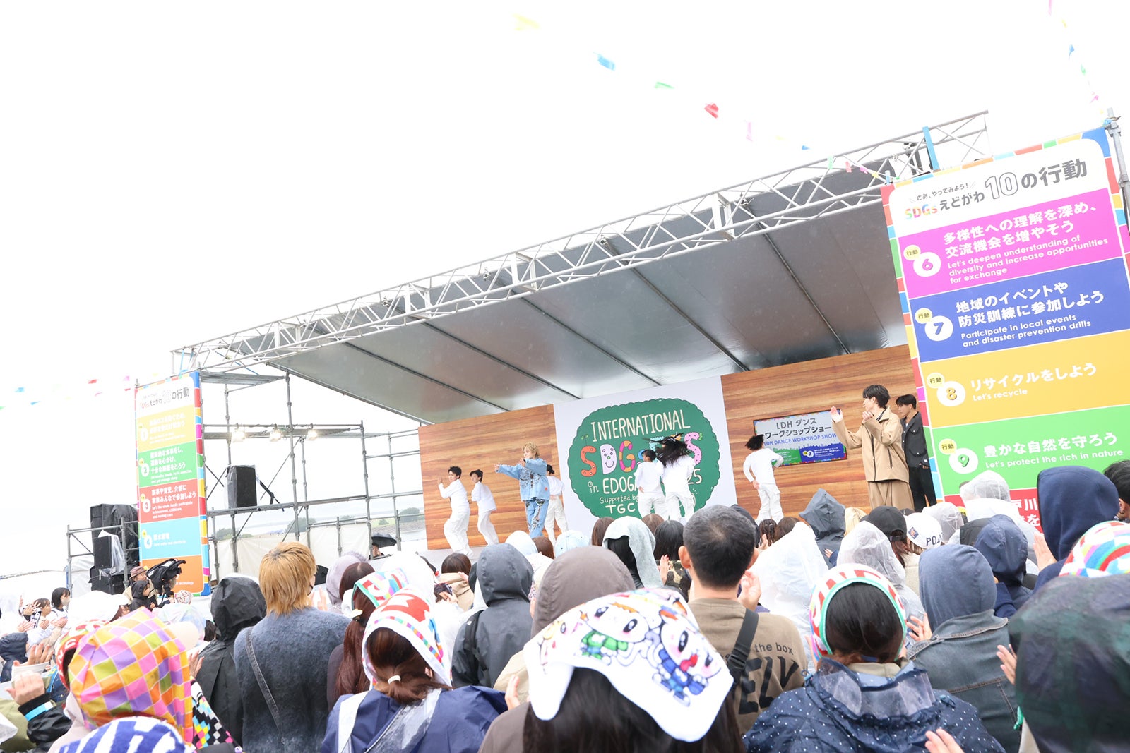 TETSUYAがプロデュースする「LDHダンスワークショップショー」には、中務に加え、江戸川区育ちの岩谷が初参加。江戸川区立葛西第三中学校ダンス部とEXPG生も登場し、EXILEの「Choo Choo TRAIN」、GENERATIONS「AGEHA」、THE RAMPAGE「Shangri-La」などLDH所属アーティストの数々の名曲に合わせてダンスを楽しみ、身体を動かしながら、SDGs目標「3.すべての人に健康と福祉を」を推進した。「我こそは!」というキッズたちを募り、ステージでキッズと踊ったり、「MORNING SUN」のダンスレクチャーの後は会場全体でTikTok撮影をしたりと一体感のあるステージで楽しませ、SDGs FESを締め括った。