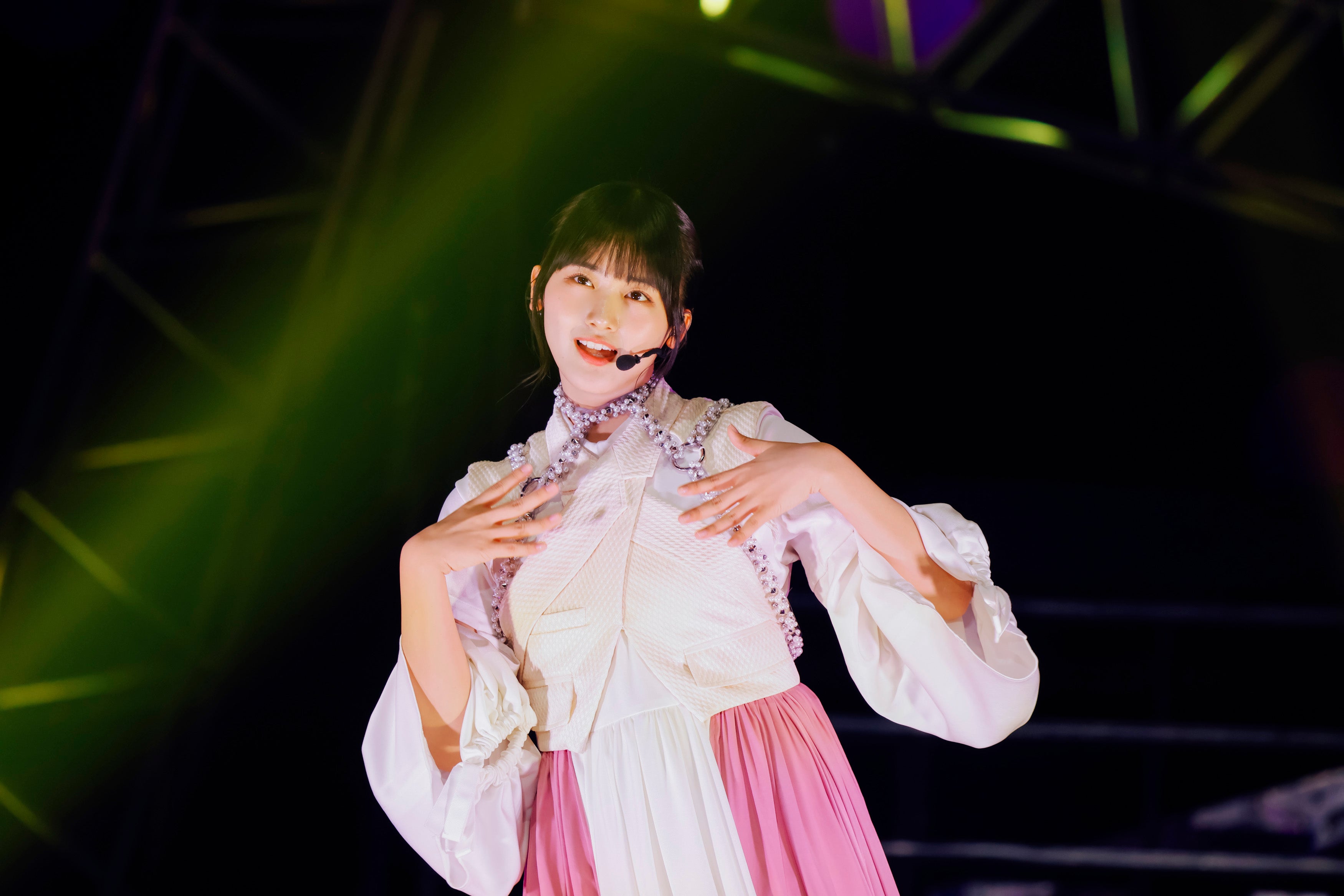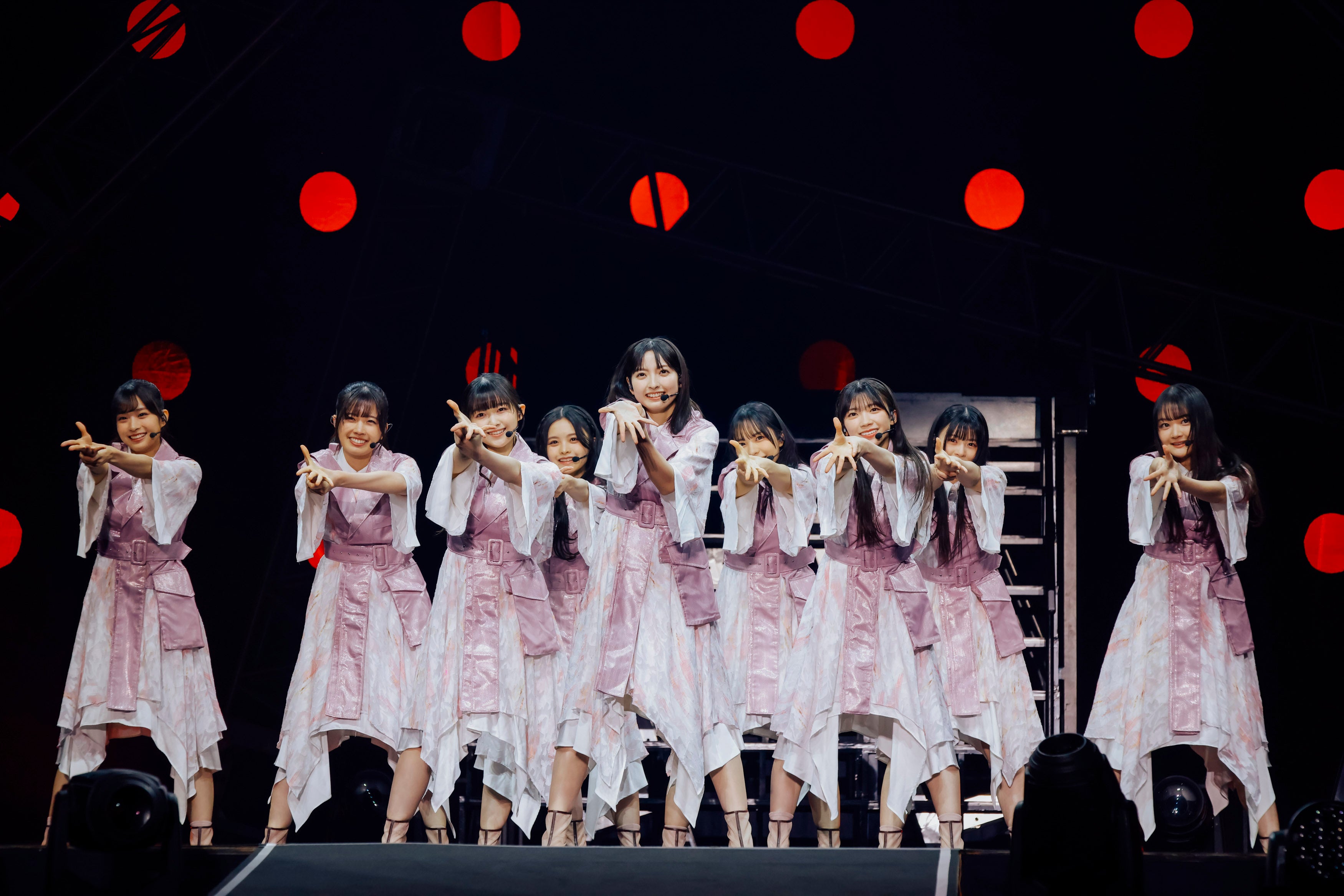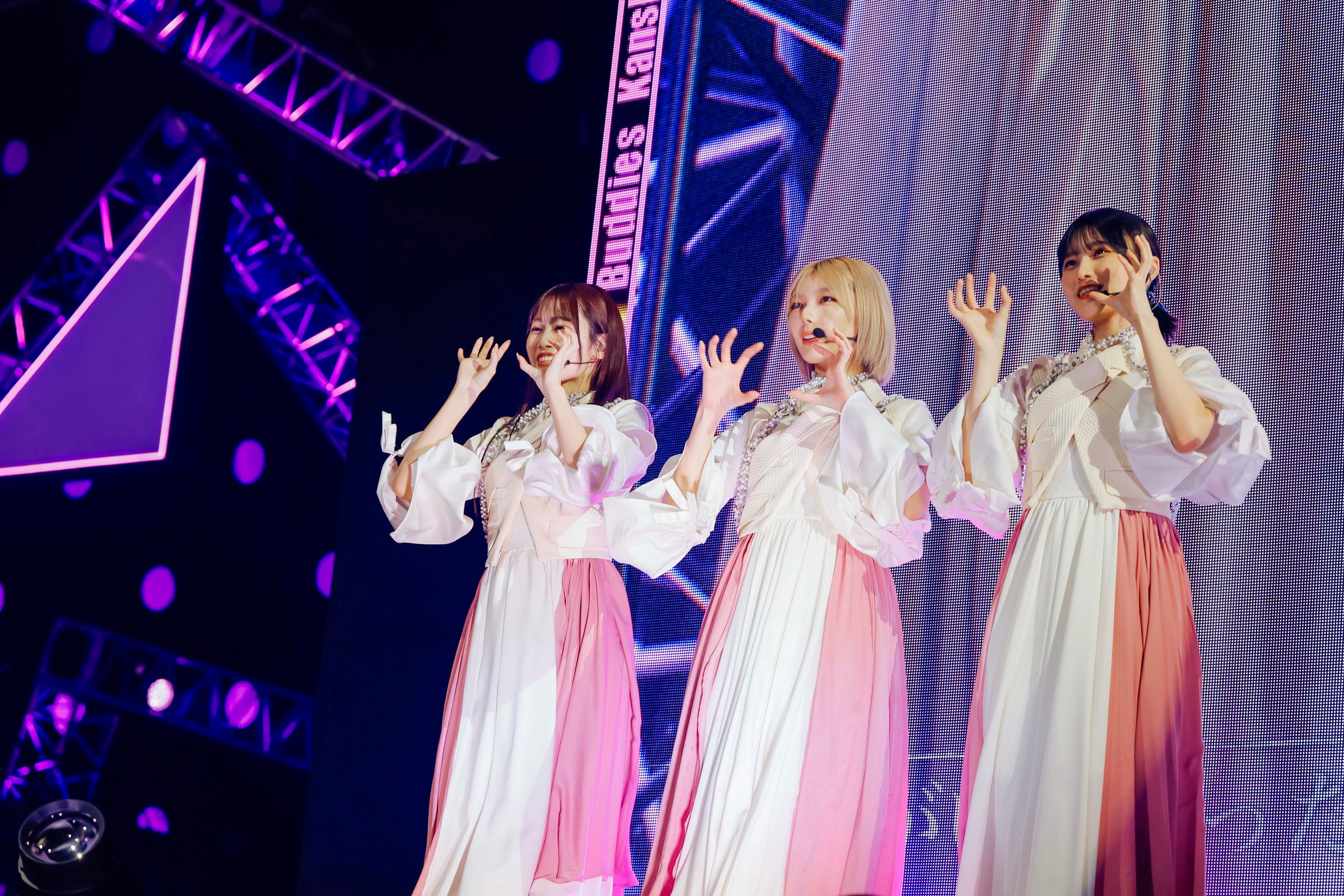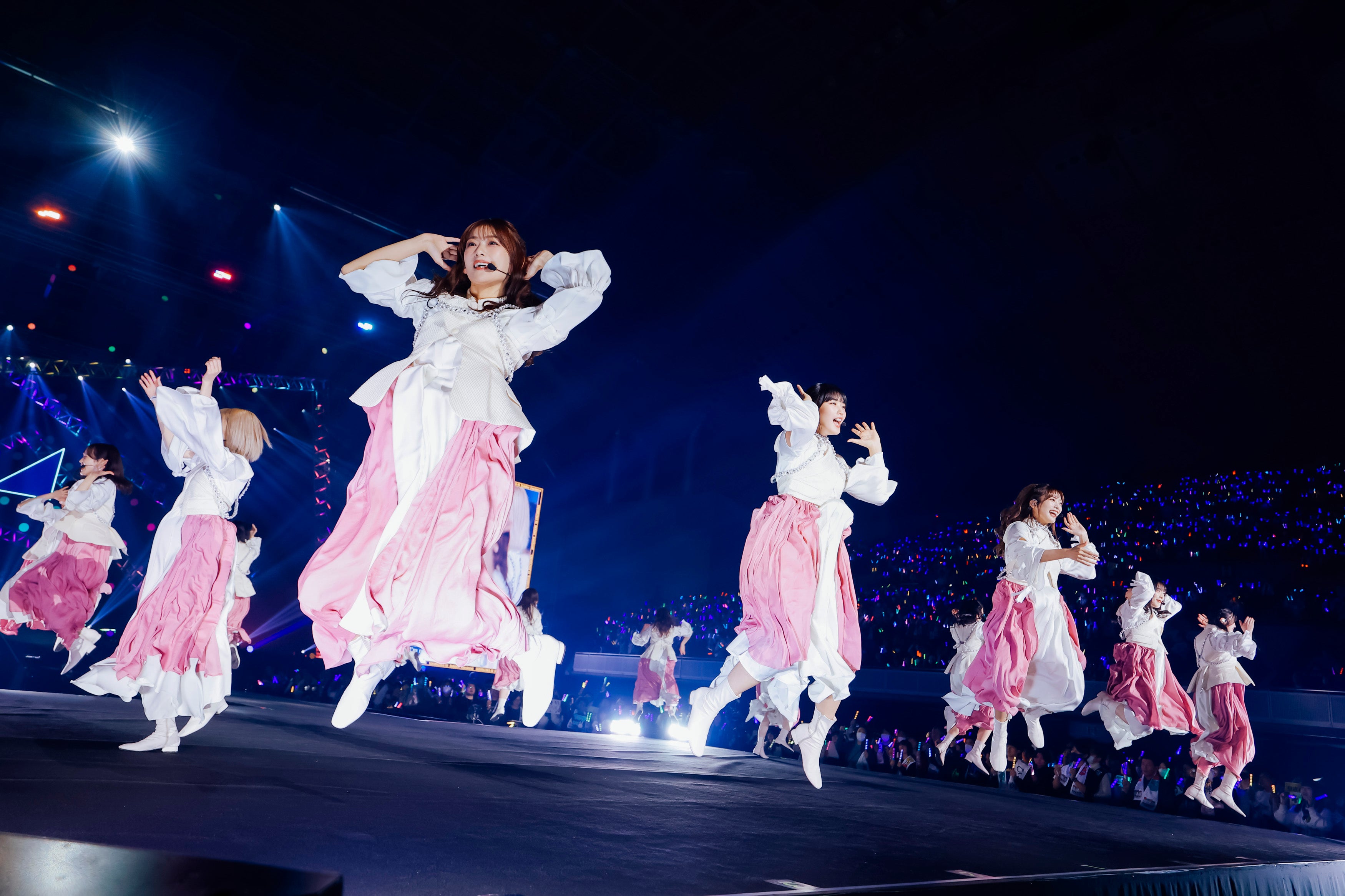 最後の最後まで安定しない活舌の井上のトークに場が和んだあとは、ライブパートへ突入。客席が井上のペンライトカラーである青1色に染まる中、久しぶりに披露される「Microscope」にてライブは幕を開ける。井上を含むオリジナルメンバーに三期生を加えた編成で、柔らかさや可愛らしさを打ち出したパフォーマンスで会場を幸福感で包み込むと、続く「桜月」では桜色に染まった客席を前に、美しさや儚さを漂わせた歌とダンスでBuddiesを魅了してみせた。MCでは谷口愛季が「滑舌が悪い人がひとりいなくなってしまうのは寂しいんですけど」と笑顔で井上について触れる一幕も。その一方で、守屋麗奈は「今日を楽しみにしていたけど、来てほしくないなとも思っていて。たくさん目に焼き付けて、思い出に残したいと思います」と意気込みを伝えた。