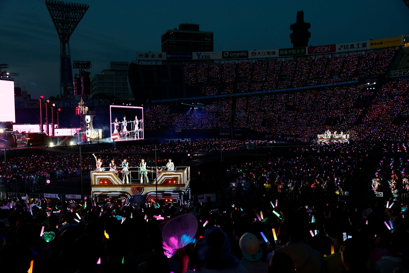 開演時間を迎えると、球場のスタンド席に立ち、『青春“サブリミナル”』を歌うメンバーの姿がスクリーンに映し出される。そしてこの曲でセンターを務める高松瞳(※「高」は正式には「はしごだか」)が会場後方のサブステージに姿を現し、映像とリンクするように一節を歌い上げたのち『Overture』が鳴り響いた。高松の「ハマスタ行くぞ!」という気合いのひと言を合図に、『青春“サブリミナル”』のパフォーマンスがスタート。チェック柄とフリルが印象的な新衣装に身を包んだメンバーは、上昇するセンターステージの上から晴れやかな歌声を届けた。また『超特急逃走中』ではトロッコで場内を巡ったほか、クレーンに乗って観客へ手を振りながら笑顔を振りまいた。グループの軌跡を振り返る映像を経て披露されたのは、佐々木舞香と野口衣織によるユニット曲『虹の素』。2人の情感に満ちた迫真のステージに、会場中の視線が釘付けになる。本公演で初披露となった『モラトリアム』では、センターを務める諸橋沙夏のペンライトカラーである緑の光で横浜スタジアムが鮮やかに染まった。