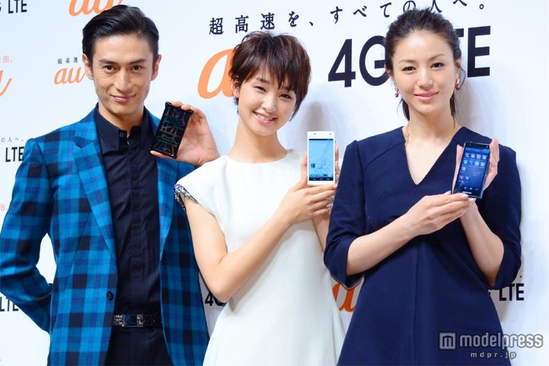 17日、都内にて「au新商品発表会」が行われ、auキャラクターを務める女優の井川遥、剛力彩芽、俳優の伊勢谷友介が出席した。