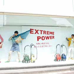 通りに面したショーウィンドウを飾ったのは、4体のマネキン。と思いきや、じっくりと近づいて見てみると、男性モデル4人が微動だにせずポージングを決めている。いたずらを仕掛け、掃除機をかざして笑い合う2人。掃除機の風に煽られ、引っ張られたスカーフに驚いたり、風に舞う新聞紙にハッとした表情を見せたりと、まるで本当に掃除機から風が出ているかのような空間に様変わり。活き活きとした表情と大胆なポージングで独自の世界観を演出し、掃除機の“吸引力”に驚かされるドラマを見事に再現した。