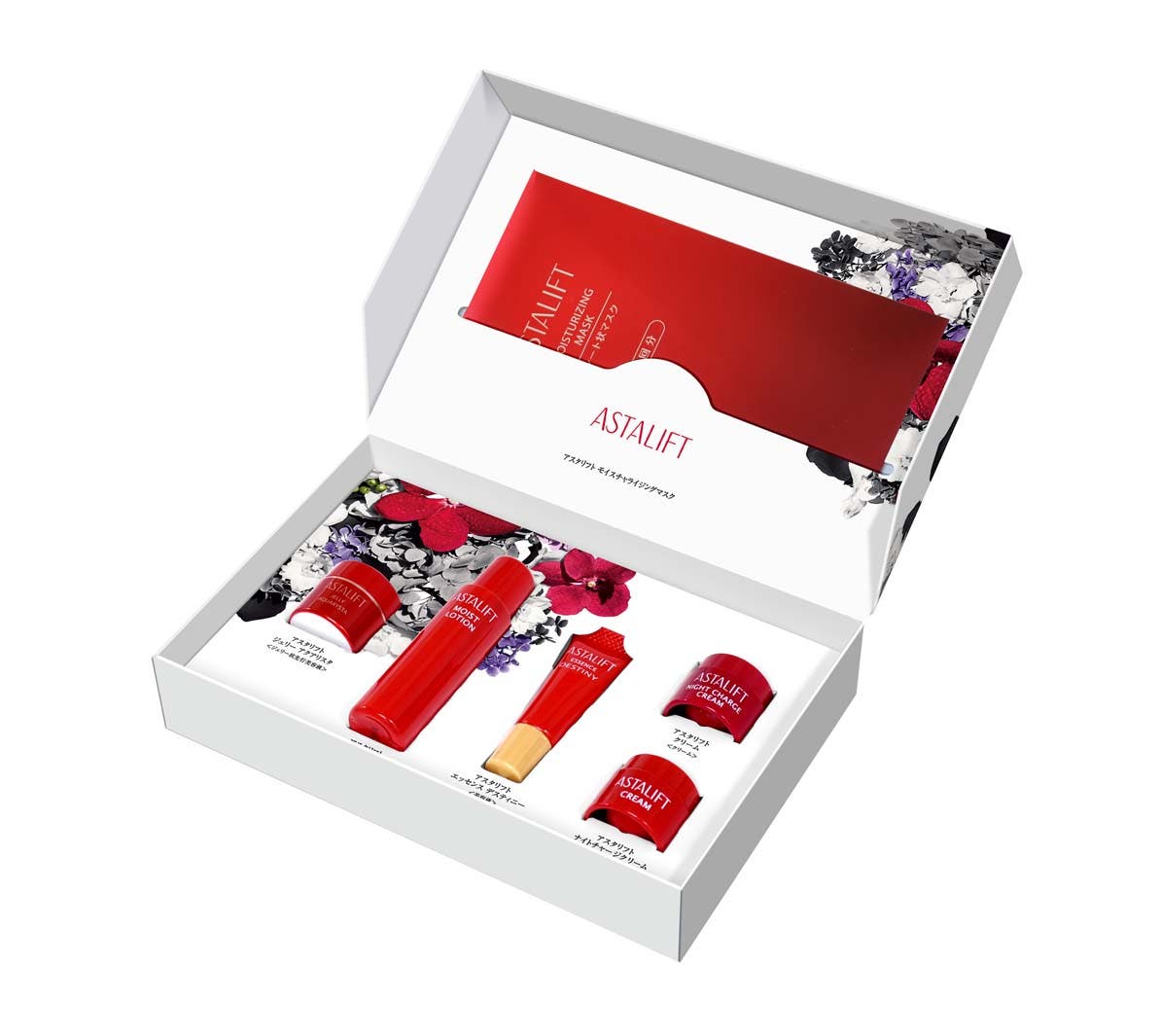 優れた赤の成分「アスタキサンチン(※1)」を独自の技術でナノ化した「ナノアスタキサンチン(※1)」をはじめ、「ナノリコピン(※2)」や3種のコラーゲン(※3)を配合し、エイジングケア(※4)を目的としたスキンケアシリーズ「アスタリフト」。つややかに輝き、ハリあふれる肌へと導く。数量限定のギフトBOXも登場