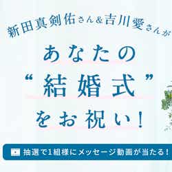 期間中に「マイナビウエディング」で成約したカップルの中から1組に、結婚式で放映する新田と吉川からのお祝いメッセージ映像をプレゼントするという。