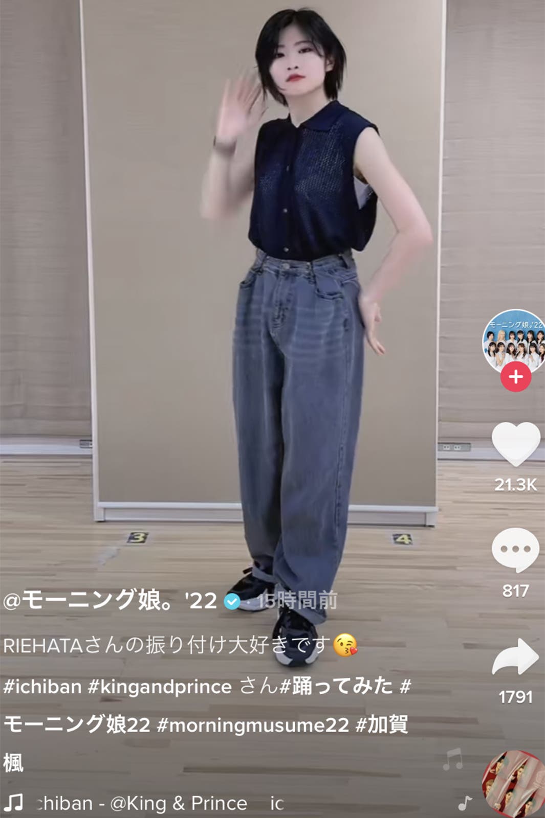 モーニング娘。’22の加賀楓が12日、グループの公式TikTokを更新。King & Princeの楽曲「ichiban」のダンスカバーを披露し、反響が寄せられている。