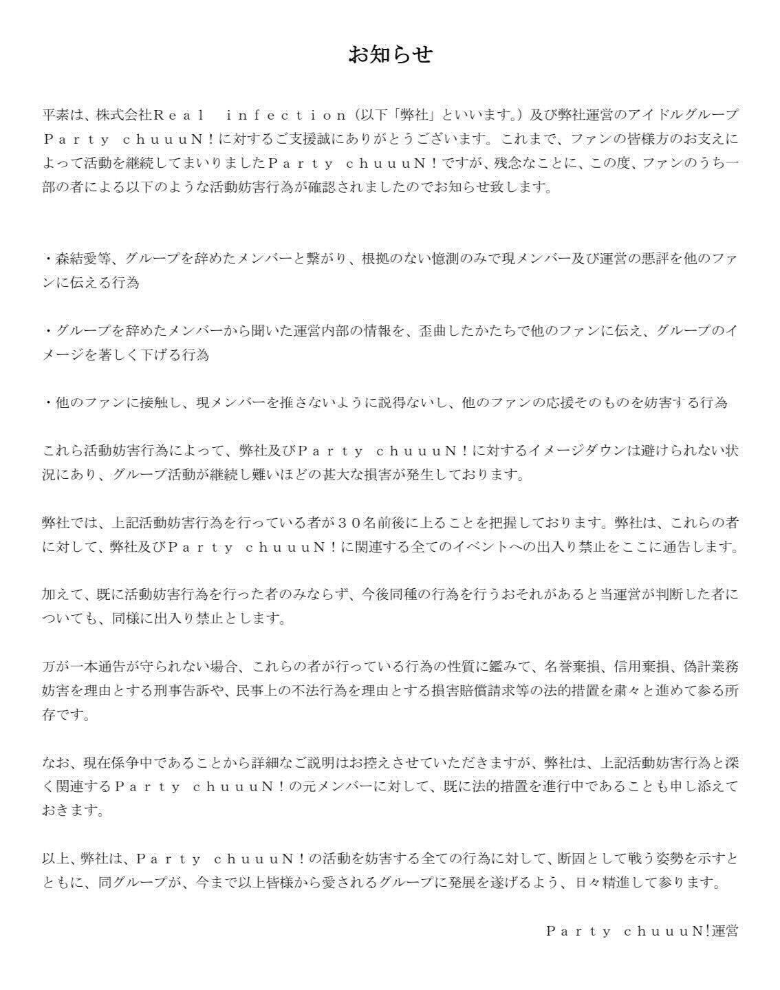 元NMB48の清水里香がプロデュースするアイドルグループ・Party chuuuN!の公式X(旧Twitter)が24日、更新された。一部ファンの出禁を発表した。