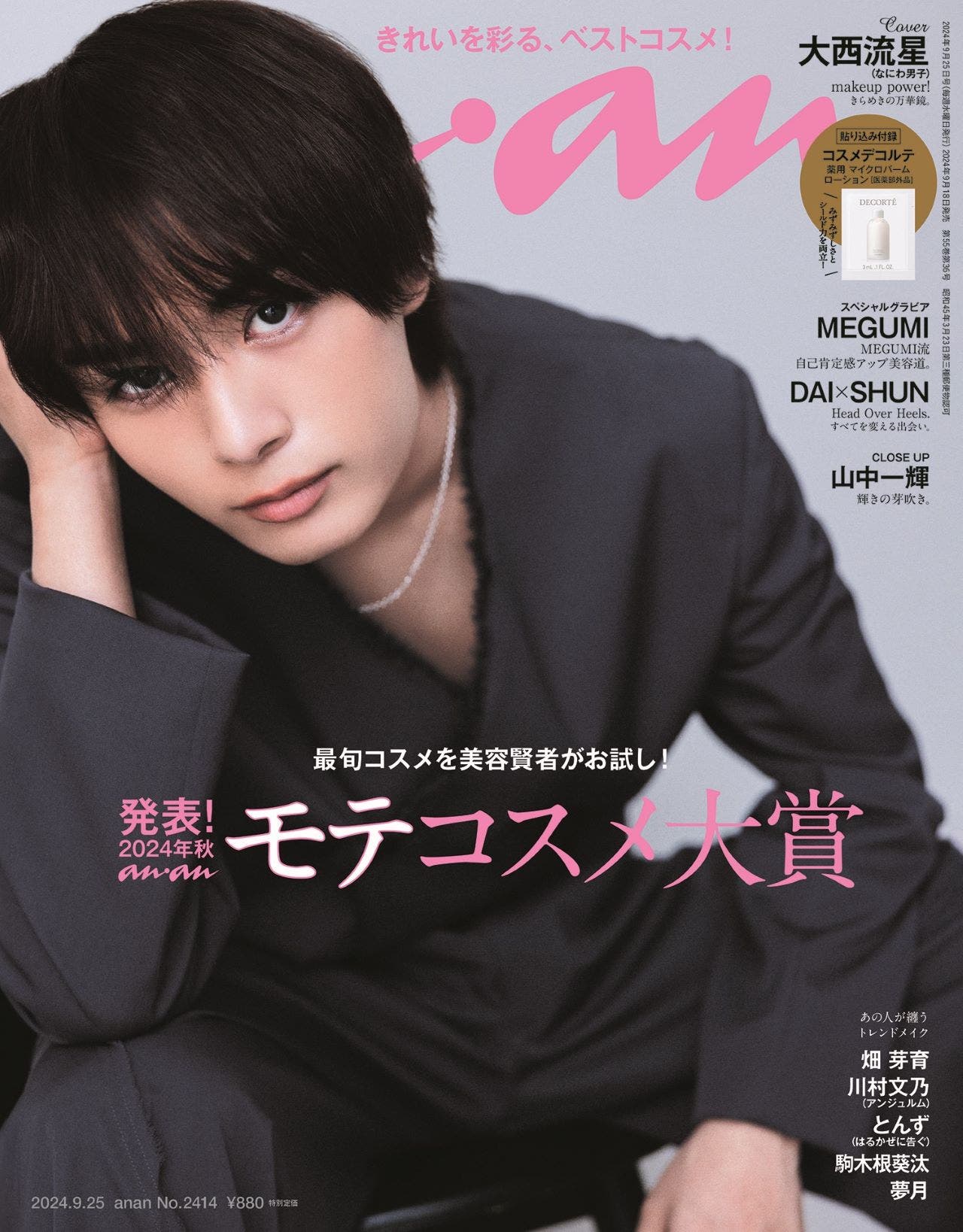 なにわ男子の大西流星が、18日発売の雑誌「anan」2414号に登場。「モテコスメ大賞」特集で同誌ソロ初表紙を務める。