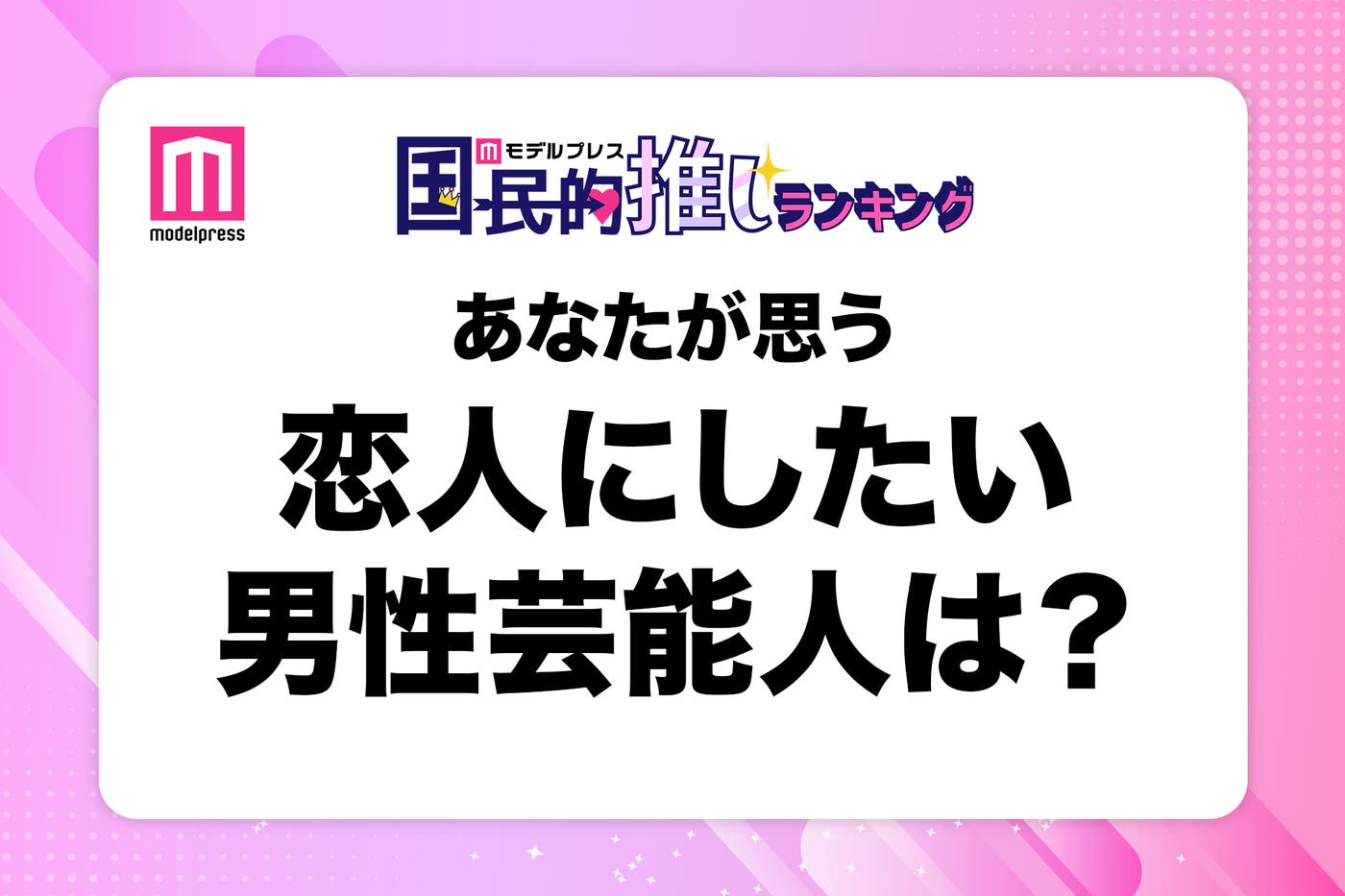 女性向けエンタメ&ライフスタイルニュースサイト「モデルプレス」では、3月14日の「ホワイトデー」に合わせて、「あなたが思う“恋人にしたい男性芸能人”は?」というテーマで読者アンケートを実施する。【モデルプレス国民的推しランキング】