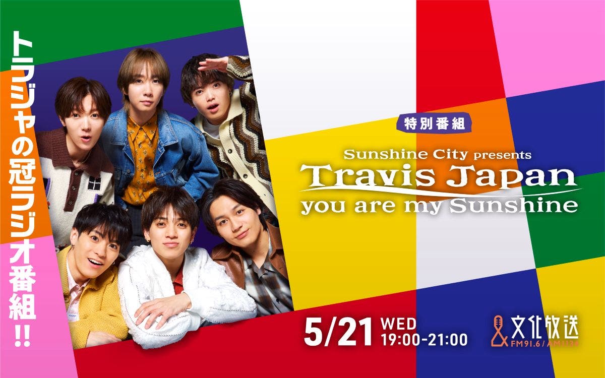 文化放送では、5月21日にTravis Japanの特別番組『サンシャインシティpresents Travis Japan you are my Sunshine』(よる7時~9時)を放送。宮近海斗、七五三掛龍也、吉澤閑也の3人が出演する。同局でTravis Japanの冠番組が放送されるのは、今回が初となる。