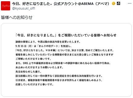 高校生による青春恋愛リアリティーショー「今日、好きになりました。夏休み編2025」(ABEMA/毎週月曜21時~)の公式X(旧Twitter)が、12日に更新された。放送内容を変更することを発表した。