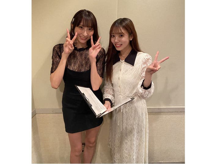 緒方咲、ミニワンピから美脚披露! 対照的な黒白コーデで美女と2ショット。
