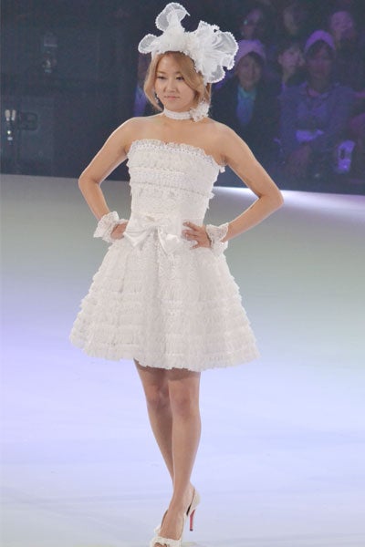 桂由美氏デザインのキュートなミニドレスで登場した4Minuteは、会場の声援を受けながら颯爽とウォーキング。