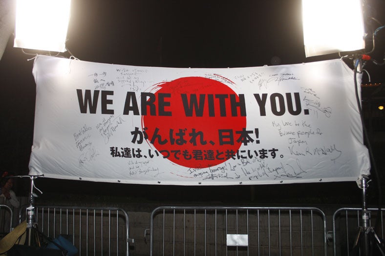 来場ゲストは急遽、日本で作られた新しい横断幕に日本を応援するメッセージを記入。日本の著名人のメッセージが書かれた横断幕も後日、遅れて届くジョニー・デップ達の横断幕とともに、東北地方の劇場に届けられる予定となっている。