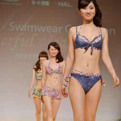 今回のコレクションでは、「Cheerful Healing」(陽気な癒し)をテーマに、毎年大人気のレースや小花柄をはじめ、大人っぽい雰囲気が漂うペイズリー柄、前から見るとワンピース、後ろから見るとビキニに見えるモノキニなど東レの2011年新作水着コレクションから、モード学園の学生がデザインしたガウンやポンチョなどのアイテムが披露された。
