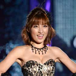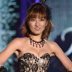 シャンパンゴールド×黒レースのゴージャスなベアトップドレスで豊満な美バストをあらわに。女子たちからの熱い声援に、笑顔で手を振り応えた。