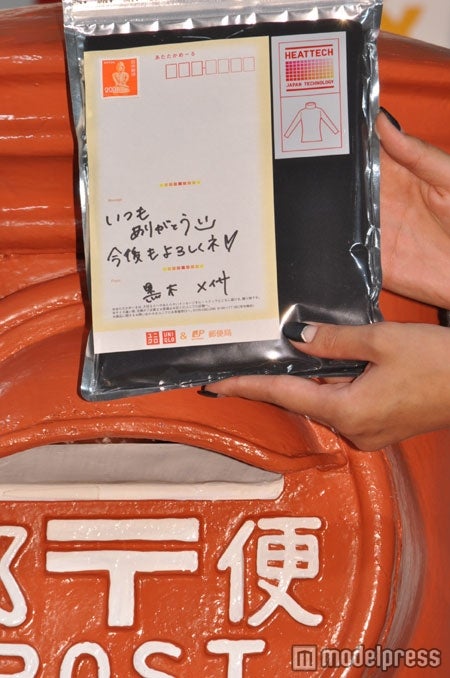 同日より主要郵便局20局と全国のユニクロで展開される「あたたかめーる」は、ヒートテックに、メッセージが記入できる送付専用シールと切手を貼り、ポストに入れるだけでそのまま商品が送れるというシステム。衣料品の販売を初めて行う郵便局の試みに黒木メイサは、「すごく素敵なこと。気持ちも伝えやすい」と太鼓判。誰に送りたいかという質問には「沖縄にいるおばあちゃんに送りたい」と話したが、ステージ上に用意されたポストに早速投函した相手を聞かれると「飲み友達に送りました。きっと喜んでくれると思います」と笑顔で語った。