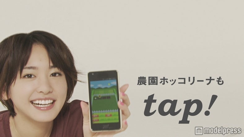 CM撮影でスマートフォンアプリ「農園ホッコリーナ」を初体験した新垣結衣は「イラストや背景がすごく可愛くて、見ててほっこりしました。ゆったりゲームが進んでいくので愛着がわきましたね」とニッコリ。