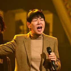 和田アキ子は、タートルニットにチェックのジャケットを羽織ったパンツルックで登場。サングラスからヒールに至るまでブラウン系で統一していた。