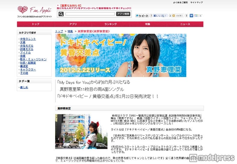 300個目の公式ファンアプリになった真野恵里菜のシングルCDリリース「ドキドキベイビー/黄昏交差点」発売日とコラボ。ファンアプリ・ポータルサイトでしか見ることができない真野恵里菜の特集記事なども掲載されている。(モデルプレス)