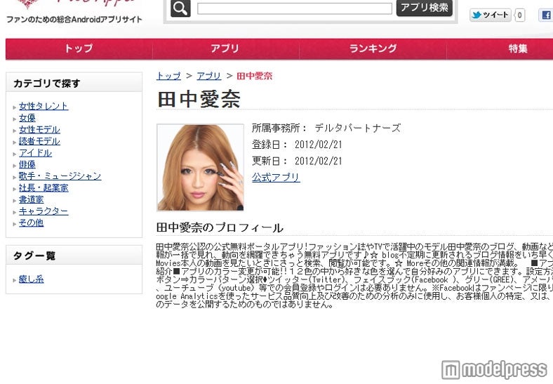 「ファンアプリ・ポータル」とは、タレント、読者モデルなど有名人のソーシャルメディアを1つのアプリで気軽に簡単にチェック出来るファンアプリを紹介するポータルサイト。
