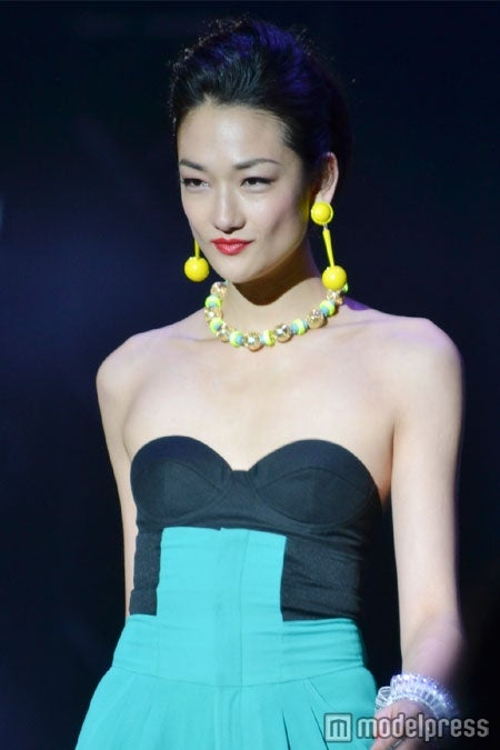 「SLY」のステージに登場した冨永愛は、鮮やかなグリーンと黒のツートーンのベアトップコンビネゾンでセクシーなデコルテをあらわに。