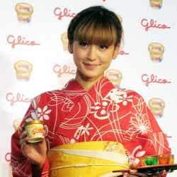 モデルの西山茉希が8日、都内で行われた江崎グリコ「カロリーコントロールアフォガード」の発表会に華やかな浴衣姿で登場した。