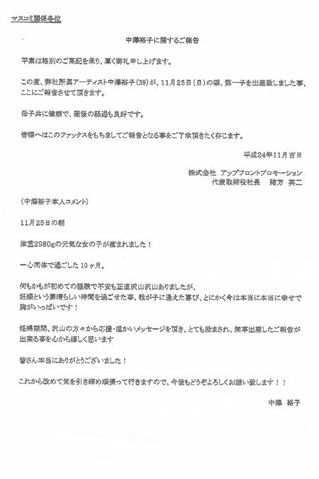 元モーニング娘。でタレントの中澤裕子(39)が25日、第一子となる女児を出産したことがわかった。報道各社にあてたFAXで発表した。