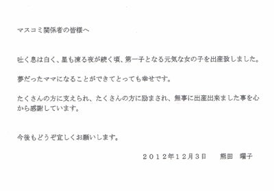 先月9日には、自身のオフィシャルブログにて妊娠への不安や覚悟を語っていた熊田。FAXの最後には、無事出産を終えたことに対し「心から感謝しています」と周囲への感謝の言葉をつづった。