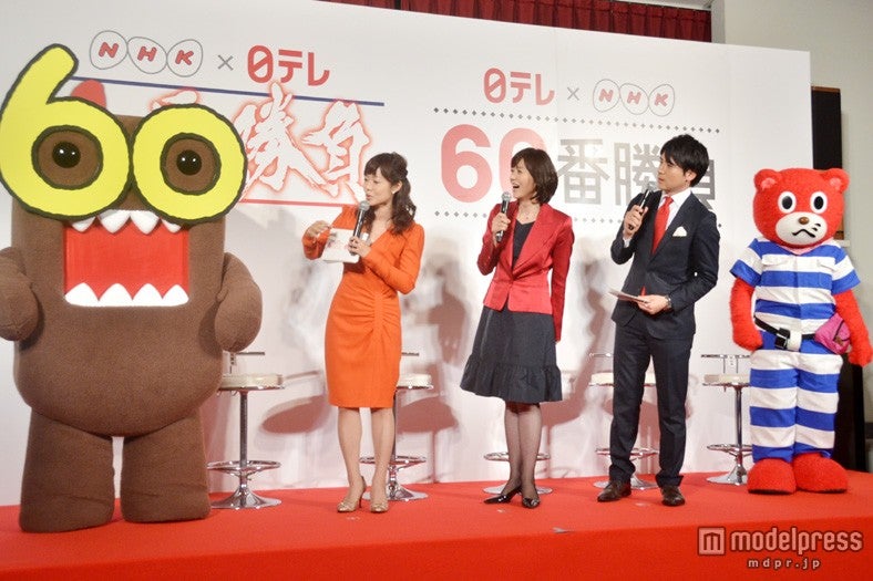 NHKの『TV60+「TV60 NHK×日テレ 60番勝負」』は2月1日(金)24:58よりNHKスタジオから生放送(全国放送)。一方、日本テレビの『日本テレビ開局60年特別番組「TV60 日テレ×NHK 60番勝負」』は、2月2日(土)24:50より日本テレビスタジオから生放送(30局ネット放送)される。なお、会見には日本テレビアナウンサーの桝太一、NHKアナウンサーの武内陶子、有働由美子らも出席した。(モデルプレス)