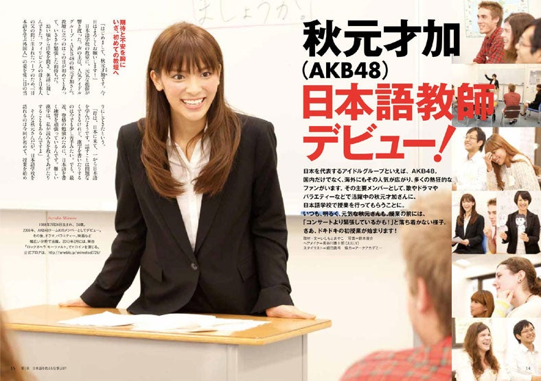 授業の前は「コンサートより緊張しているかも」と落ち着かない様子だったが、いざ教室に入ると「はじめまして、秋元才加です。今日はよろしくお願いします!」と元気に挨拶。今や海外にもその人気が広がっているAKB48とあって、学習者の中には熱狂的なAKBファンの姿も。誌面では大いに盛り上がった授業の様子が紹介されている。