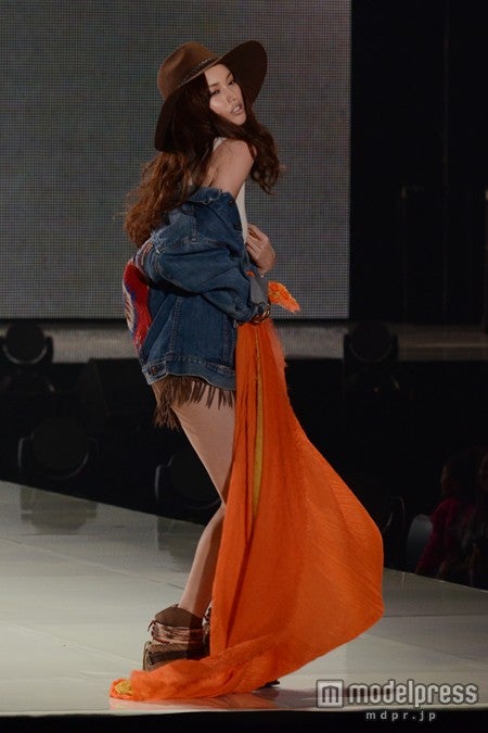 「goa」ステージのトップバッターを飾った蛯原は、デニムジャケットにブラウンのハット、フリンジのついたショートパンツを合わせたボヘミアン調の衣装で登場。颯爽とウォーキングをしながらサングラスをクールに外すと、ランウェイ先端ではジャケットを脱ぎセクシーポーズを決め観客を魅了した。