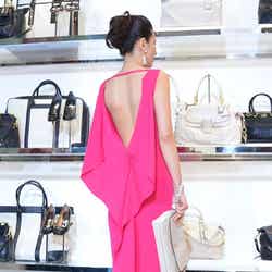背中がざっくりと開いたビビットピンクのドレスで、磨きぬかれたボディを披露した長谷川。コーディネートのポイントを「クラッチバッグとシューズです」と紹介し、「春なので、なるべく明るい色を取り入れるようにしています」とファッションへのこだわりを語った。