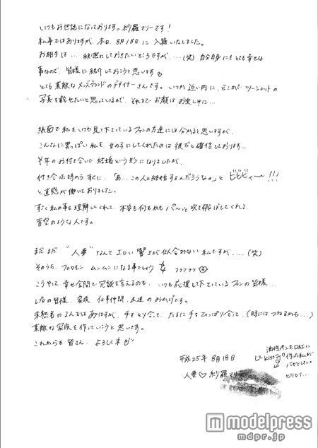 紗羅は8月18日、自身のブログでメンズブランドのデザイナーをしている一般男性と半年間の交際を経て入籍したことを発表。「こんなに男っぽい私を、女の子にしてくれたのは彼だと確信しております。半年のお付き合いで結婚という形になりましたが、付き合った時からすぐに、『あ…この人と結婚するんだろうな』とビビビィ~!!!と直感が働いておりました」と幸せいっぱいにつづった。また、紗羅の所属事務所は、モデルプレスの取材に対して「挙式の予定は未定で、妊娠はしていない。今後も今まで通り仕事をしていく」とコメントしている。(モデルプレス)