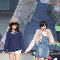 山本はデニムサロペットにファーベスト、渡辺はネイビーのニットにチェック柄シャツをレイヤードした秋ファッションで登場。仲良く手をつないでウォーキングし、ランウェイの先端でキュートなポージングを決めると、1万2千人の観客から大きな歓声が上がった。