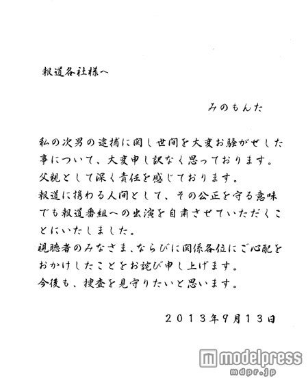 みのは、「私の次男の逮捕に関し世間を大変お騒がせした事について、大変申し訳なく思っております。父親として深く責任を感じております」と改めて謝罪。「報道に携わる人間として、その公正を守る意味でも報道番組への出演を自粛させていただくことにいたしました」と発表した。