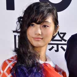 胸元のスカーフがアクセントになった赤のレトロなワンピースで登場した忽那。巻き髪で毛先を青に染めた大胆なヘアスタイルが個性的な印象。俳優の岡田将生とともに、観客の声援に笑顔で応えながら堂々とウォーキングした。