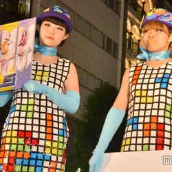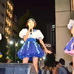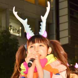 Tシャツ、パーカーに宇宙柄のミニスカートを合わせ生足を披露した中川。今日のファッションは「全身びっしりマミタス(=猫)でございます」とコメントし猫ポーズをキュートに取ると、パンプスのかかとに付いた猫のしっぽモチーフを見せ、集まった人々を魅了した。