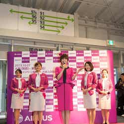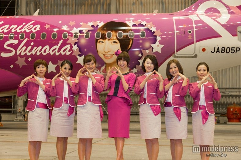 ピンク色の制服姿で特別デザイン機「MARIKO JET」に乗り込み、機内アナウンスなどを行った篠田。初めてのフライトを「とても楽しく、あっという間に到着しました」と振り返り、「私の顔がデザインされていて、とてもかわいらしい飛行機です。Peachを使えば、気軽にいろいろなところに出かけられるので、これからも飛行機を使ったお出かけがもっともっと身近なものになったらいいなと思います」と話した。