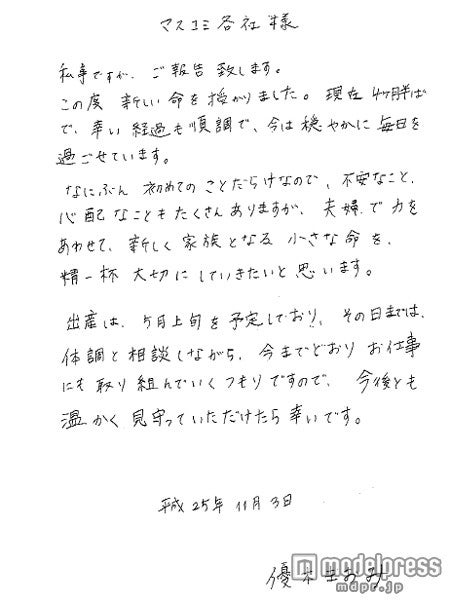 優木は所属事務所を通じて、直筆の文書で第1子の妊娠を発表。現在妊娠4ヶ月で「なにぶん、初めてのことだらけなので、不安なこと、心配なこともたくさんありますが、夫婦で力をあわせて、新しく家族となる小さな命を、精一杯大切にしていきたいと思います」とママになる心境をつづった。
