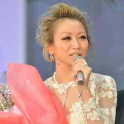また私生活では、2011年12月にBACK-ONのボーカル&ギター担当・KENJI03(ケンジスリー)と結婚し、2012年7月に第1子が誕生。母親とは思えぬ圧巻のスタイルに舌を巻いたMCから、スタイルキープについて問われると、「出産して3ヶ月は野菜メインで、ご飯も玄米、牛乳も豆乳などと食事を変えました。ダイエットで運動っていうのは苦手なので」と明かした。