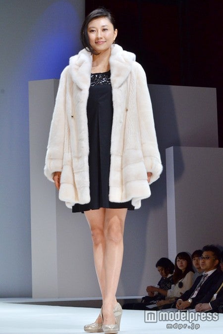 28日、都内にて行われた「第9回ファー・オブ・ザ・イヤー」授賞式に出席した菊川。レースをあしらった黒のミニワンピースに純白ファーのコートを合わせ、美脚を披露した。